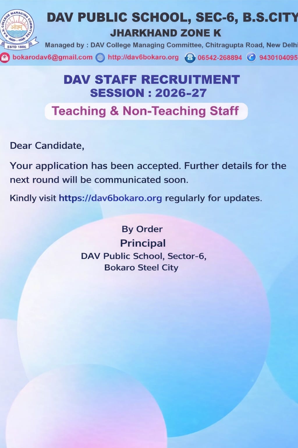DAV Public School, Sector-6, Bokaro Steel City, Jharkhand - 827006 Phone - 9430104095, 06542-268894, Email :- bokarodav6@gmail.com